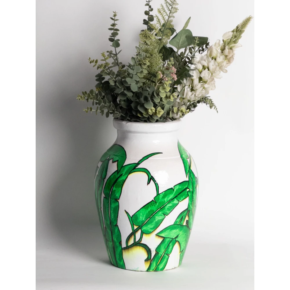 Hand-painted oversized tropical leaves in layered emerald and lime tones create a vibrant, eye-catching design. The crisp white glazed base enhances the richness of the green artwork, giving the vase a fresh, contemporary aesthetic that suits modern interiors.