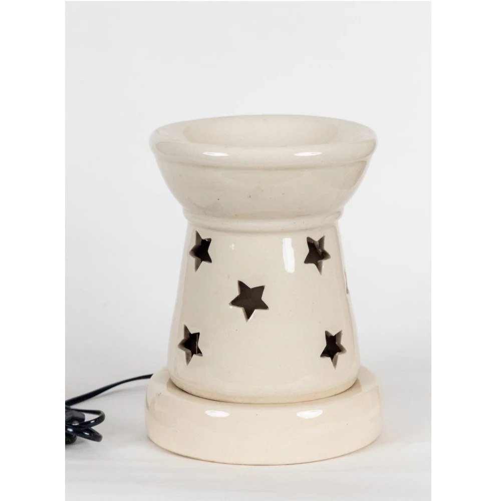 This handcrafted ceramic aroma oil burner is designed to bring warmth, fragrance, and visual charm into your home. Made from high-quality ceramic and finished in a smooth ivory glaze, it features beautifully cut star-shaped openings that softly diffuse light when in use, creating a peaceful and inviting atmosphere.
