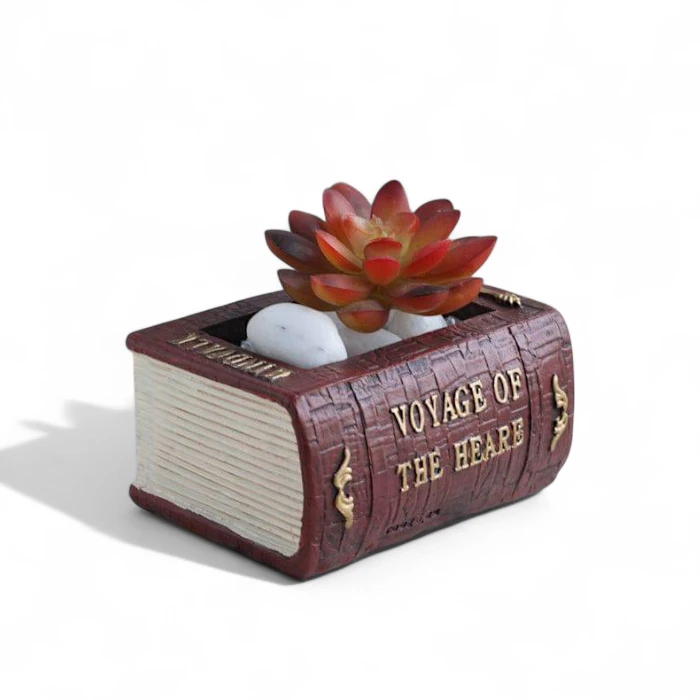 Perfect for succulents, cacti, or small florals, it doubles as a thoughtful gift for book lovers and décor enthusiasts. Whether styled on a coffee table, office desk, or bookshelf, it adds a literary charm and earthy warmth to any space.