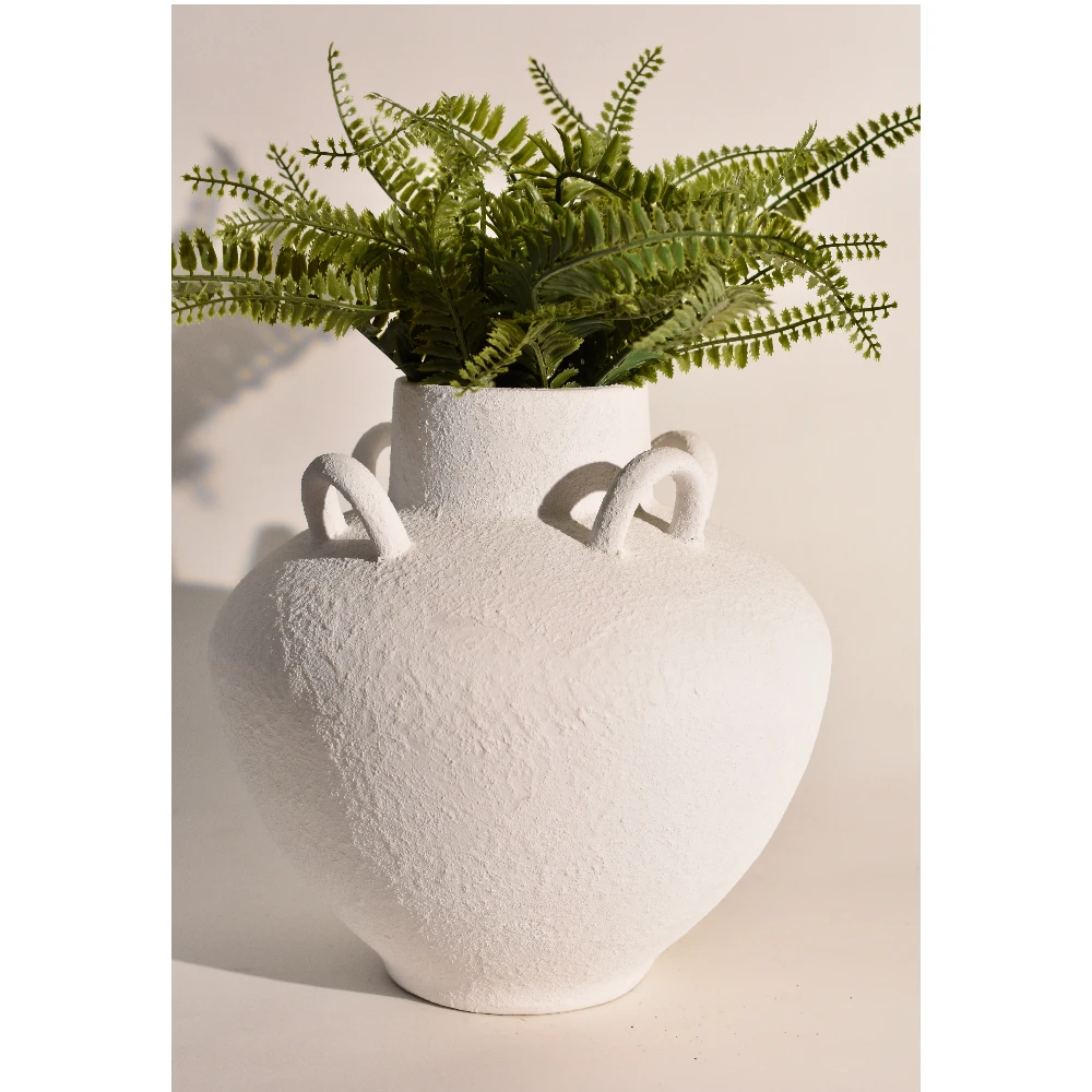 Inspired by Mediterranean pottery aesthetics, this handcrafted white rustic vase is a timeless décor accent that brings softness and organic character into any space. The tactile matte texture combined with triple looped handles gives it a sculptural presence, making it a standout styling piece for consoles, coffee tables, corners and shelf displays.